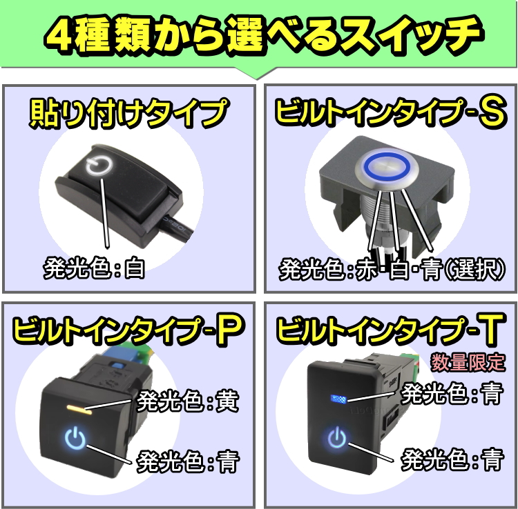 →ビルトインスイッチTは夜間照明(青)、インジゲーター(青)のみ設定。数量限定のため在庫なくなり次第販売終了
